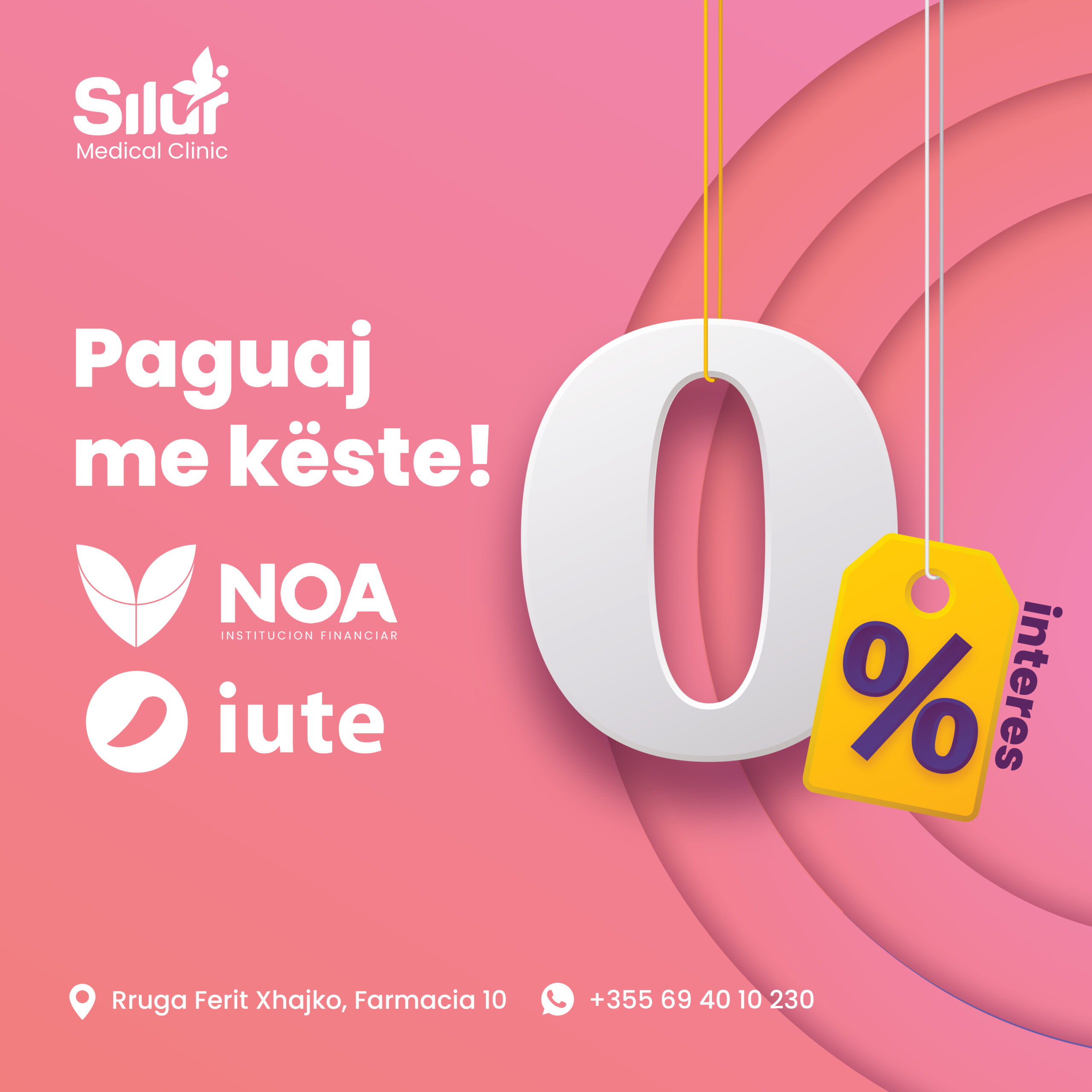 Në Silur Clinic, kujdesemi që çdo pacient të ketë mundësinë të përfitojë nga trajtimet estetike dhe kirurgjitë plastike pa pasur pengesa financiare. Për këtë arsye, kemi krijuar partneritete të posaçme me institucionet financiare NOA dhe Iute Albania, duke ofruar plane fleksibël pagese, të dizajnuara për t’ju përshtatur nevojave tuaja.